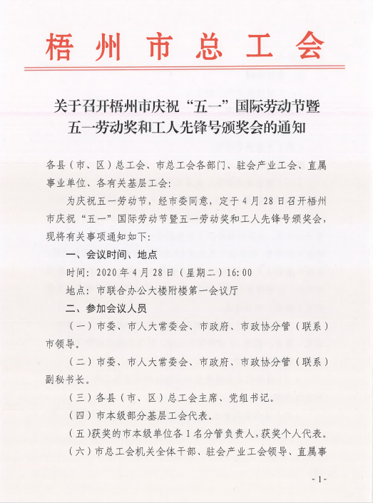 關(guān)于召開梧州市慶?!拔逡弧眹?guó)際勞動(dòng)節(jié)暨五一勞動(dòng)獎(jiǎng)和工人先鋒號(hào)頒獎(jiǎng)大會(huì)的通知