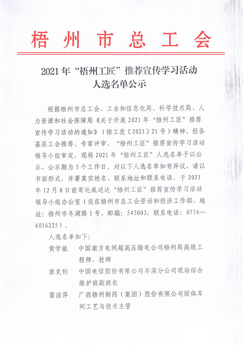 2021年“梧州工匠”推薦宣傳學(xué)習(xí)活動人選名單公示