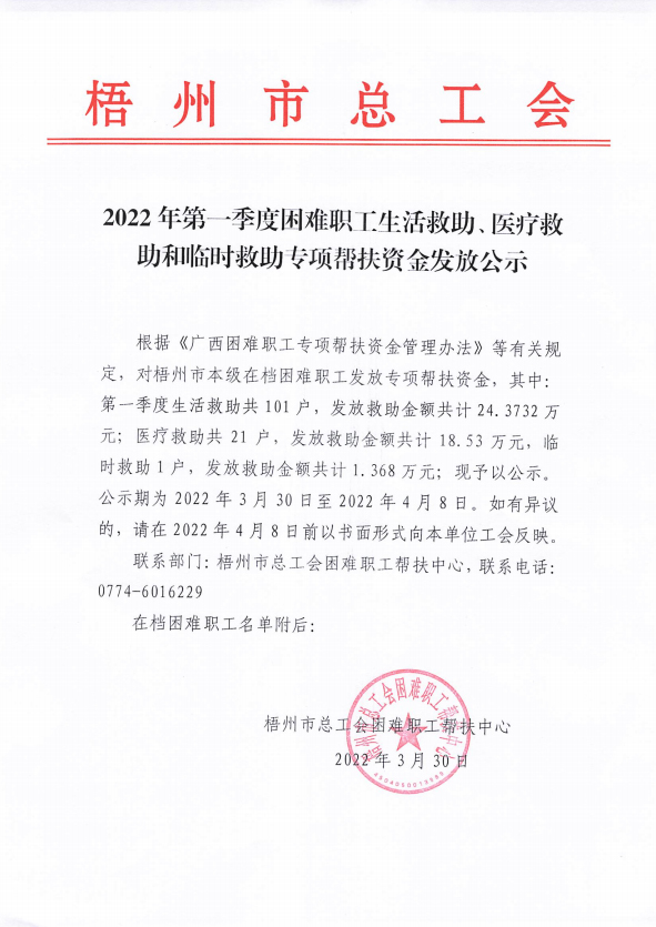 2022年第一季度困難職工生活救助、醫(yī)療救助和臨時(shí)救助專項(xiàng)幫扶資金發(fā)放公示