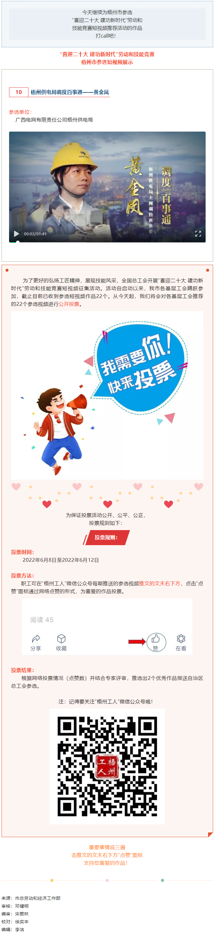 廣西電網(wǎng)有限責(zé)任公司梧州供電局參選作品(二)丨“喜迎二十大 建功新時(shí)代” 勞動(dòng)和技能競(jìng)賽短視頻投票活動(dòng)開始啦!